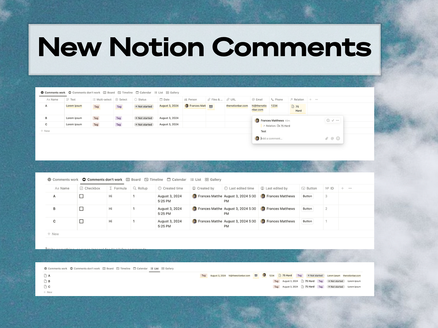 Little quality of life update! You can now comment directly on Notion database properties. The image above shows which properties it works on and doesn’t work on.